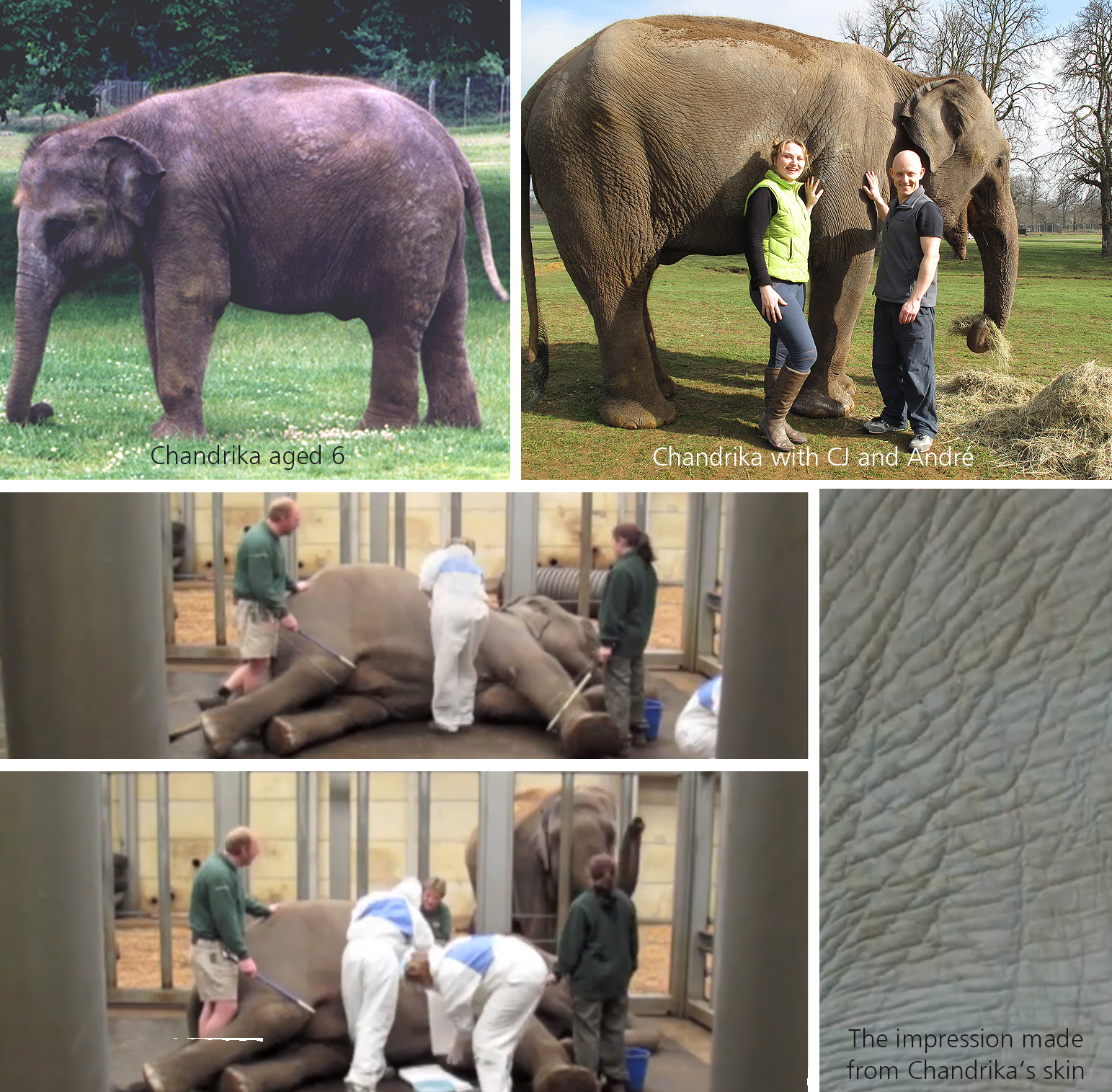 CJ: André wasn’t at all nervous, having worked with elephants before, but I must admit I was a bit worried beforehand. I’ve worked with horses in the past who can be skittish and kick on occasion and I do remember saying to friends ‘This could be a very embarrassing way to die!’ before we went. But once I’d been introduced to Chandrika and the other elephants at Woburn I felt so safe with them. Despite their enormous size, they are in fact extremely agile on their feet, always watchful and careful not to step on us, bump into or push us around. They were also very playful, using their trunks to sniff around our pockets, checking for treats and generally being quite mischievous. But discovering just how intelligent and sensitive they are also reassured me. Chandrika, like many elephants living in captivity, understands about as much as a human toddler and we could ask her questions to which she would either nod or shake her head in reply. In this way I felt reassured we had her permission to cast her, especially as the ‘payment’ was a bucket of fresh apples which she didn’t have to share with the other elephants. She was so cooperative and patient with the process – much more so than many of the children we get coming to the lifecasting studio!