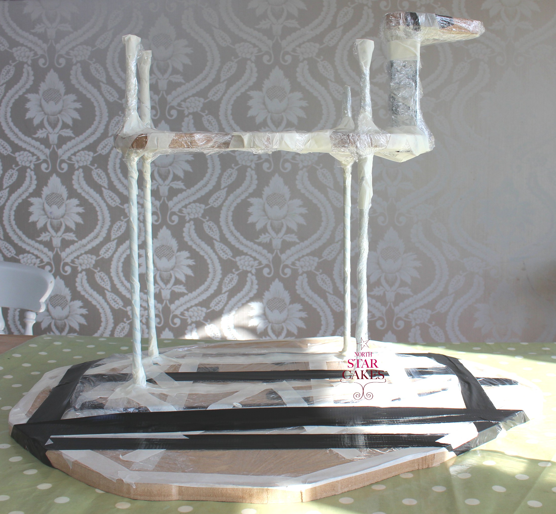 Having never made a lamb cake we were pretty interested to see the frame. Francesca carefully worked out the proportions for the body so that the straight rods were as far forward as possible to allow for the legs to be built up at the knee, hock and thigh to give the illusion of a backwards bending leg like a lamb. The legs were also made longer to allow for the ground to be built up on the boards underneath. Proportionately shaped MDF ‘shelves’ were added at the deepest part of the belly and head to give much needed structural support and a base for the cake.