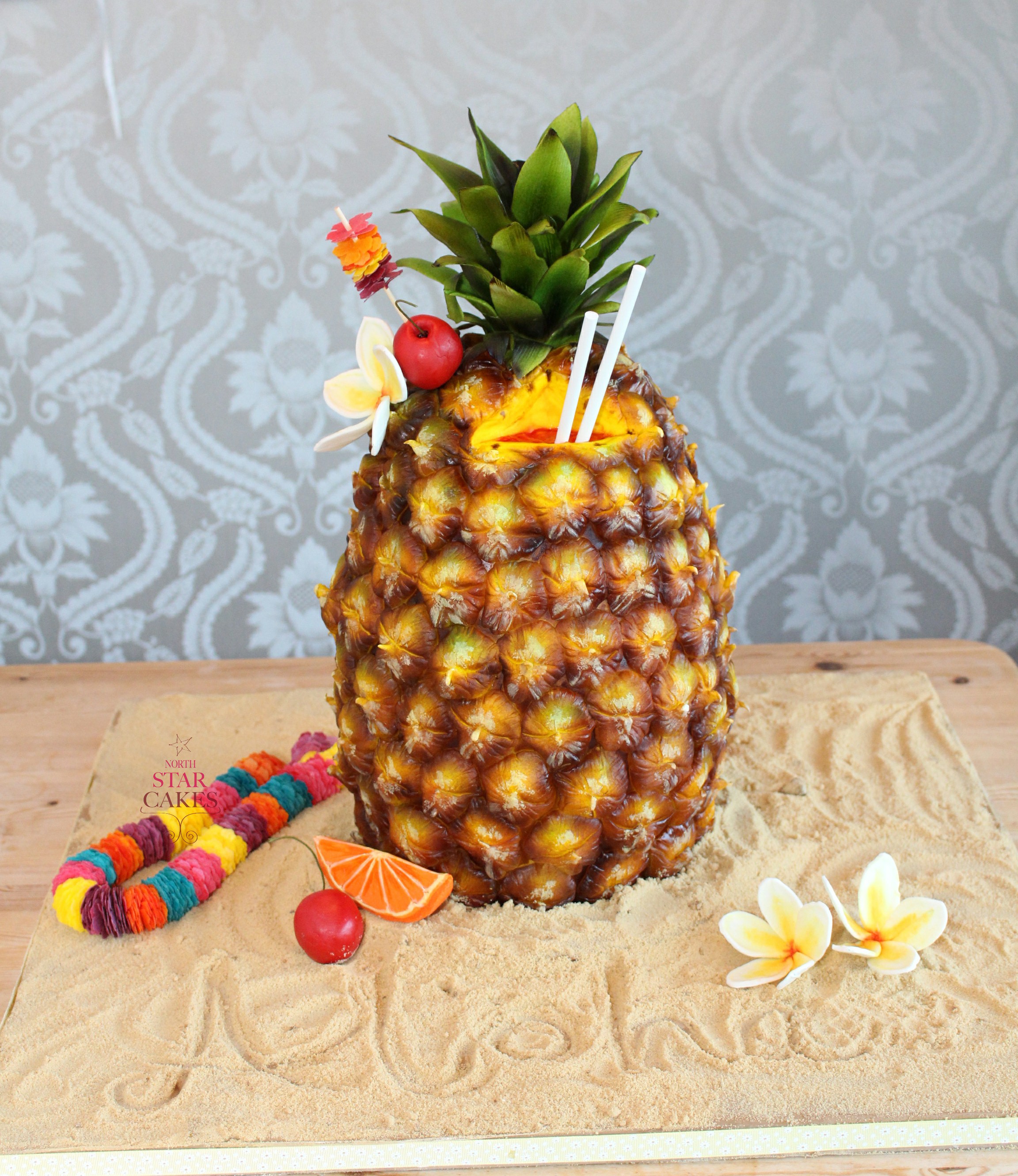 Earlier this month Cakebomber Francesca Pitcher of North Star Cakes brought the tropical sun of Hawaii to Oak Furnitureland Broadstairs. Francesca constructed an oversized pineapple punch cocktail cake which any holiday maker would be thrilled to receive on a sunny beach! The 20 inch tall cake was made in three (very long) days and consisted of 4 large stacked vanilla cakes carved and split with vanilla buttercream, 960 hand made edible rice paper flowers threaded to make a colourful Hawaiian Lei – which took 4 hours on its own to make. The cake was accompanied by oversized frangipani flowers, glacé cherries, an orange segment and the whole cake was placed on a tropical edible ‘sandy’ beach. After the official store opening with the Oak Furnitureland staff and the lady Mayoress the cake was presented to DreamLand Margate, the recently re-opened pleasure beach just down the road from the store. The cake was displayed during the Dreamland Hawaiian Luau event that weekend and cut for the public by one of the visiting Hawaiian dancers at the party. Sounds fun!